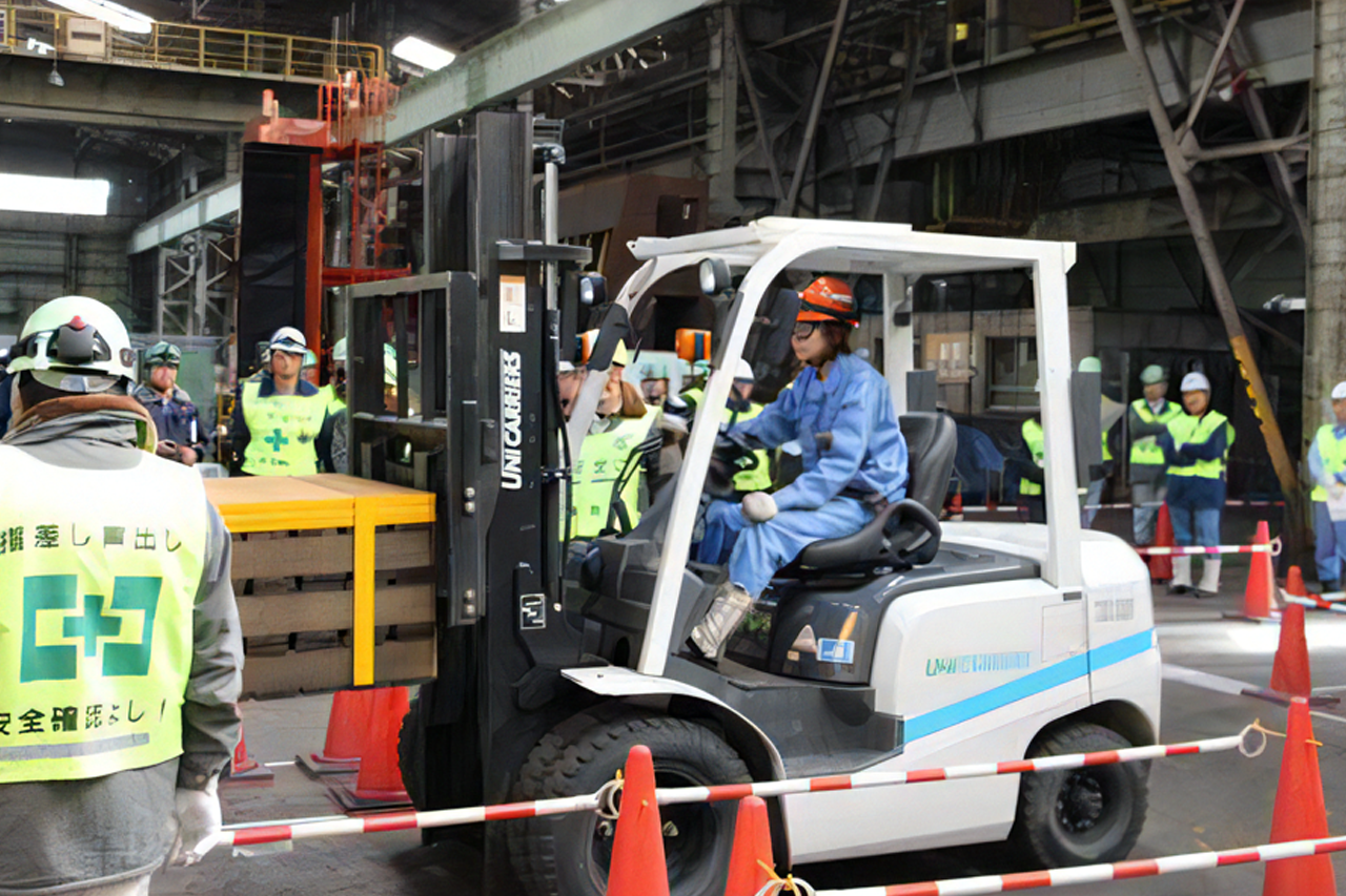 年1回、クレーン・フォークリフトの運転や火花検査などの技能を競い合う「社内技能競技会」が行われます。
