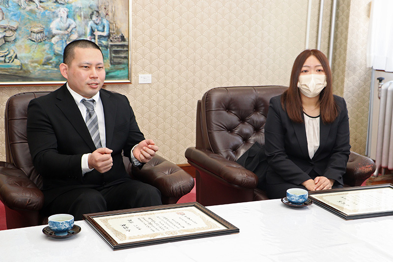 表彰後の会話では火災時の発見状況や、迅速な対応について青山市長より質問され、「日頃より会社で実施している火災・避難訓練のおかげで初期初動を迅速に行う事ができた。」とお話されていました。