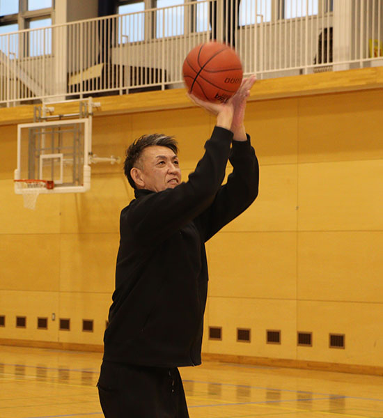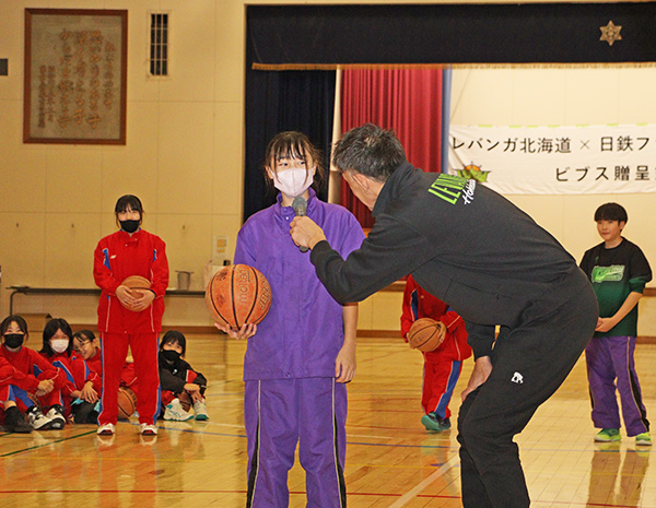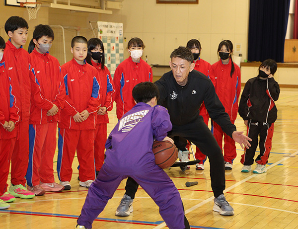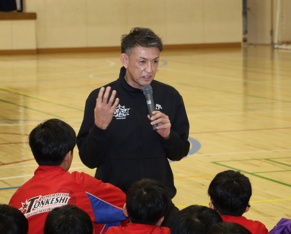 贈呈式後は、折茂社長によるクリニックが行われ、両少年団からのリクエストに応えてフィニッシュスキルとシュートのコツについてレクチャーされました。