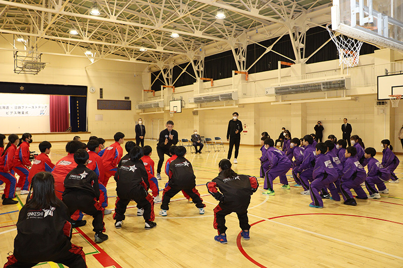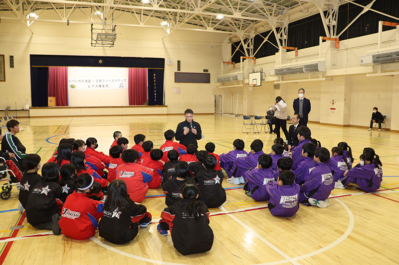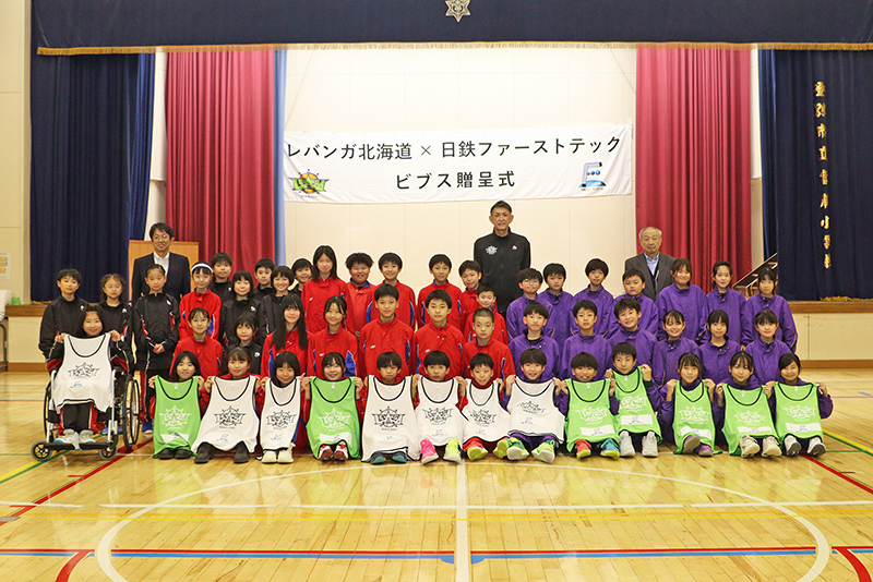 12月1日、富岸小学校にて、レバンガ北海道様と当社協賛による「ビブス贈呈式」が行われ、登別富岸ミニバスケットボール少年団と登別若草ミニバスケットボール少年団それそれにビブス計28枚を寄贈しました。